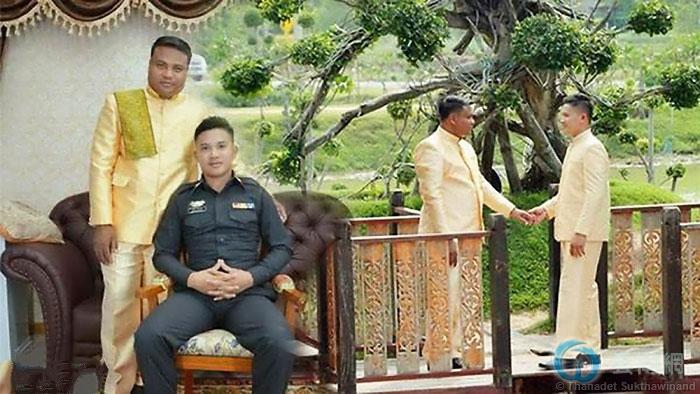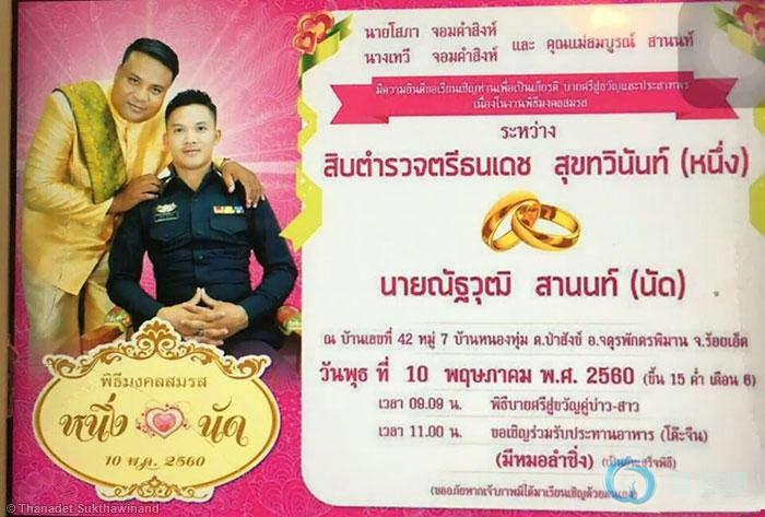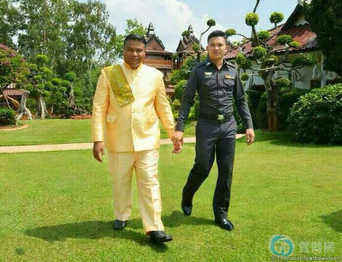 泰国大城府警方官员昨天证实近期在网络上热传的“警员同性婚礼”是真事,两位新人分别是29岁的警察准下士塔纳迪(Thanadet Sukthawinand)和38岁的商人纳塔武(Nattawut)。