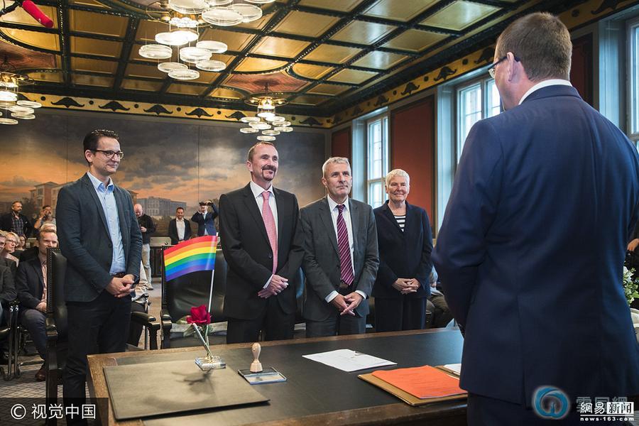 中新社柏林10月1日电 “是的,我愿意。”当地时间1日上午9时30分,60岁的博多·蒙德和59岁的卡尔·克赖勒在柏林舍内贝格市政厅内登记成为德国第一对合法同性婚姻伴侣