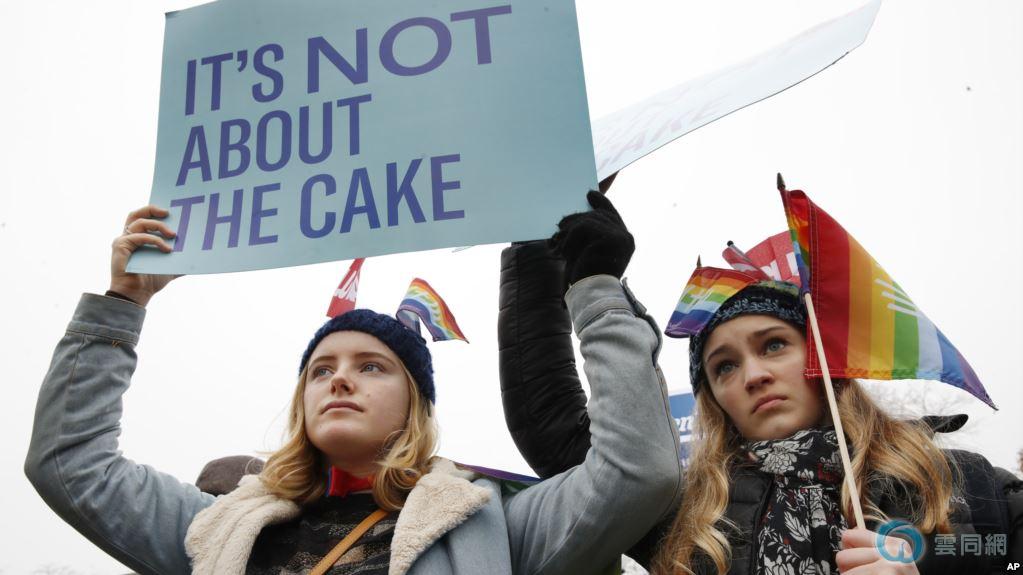 2017年12月5日,两名支持同性婚姻的女青年在联邦最高法院外的集会上高举“这不关乎蛋糕”的标语。
