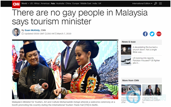 近日,多家外媒都在报道马来西亚旅游部长穆罕默丁5日在德国柏林国际旅游贸易展览会(ITB Berlin)上针对同性恋的表态:马来西亚没有同性恋。