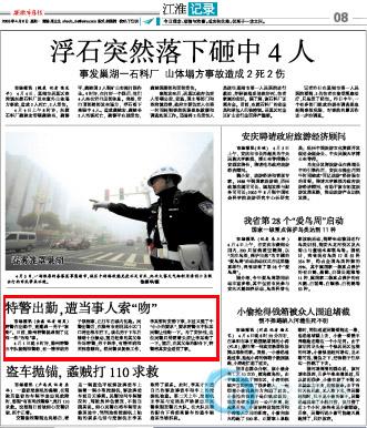 4月1日晚9时许,滁州特警五中队接到报警称,有一精神病男子欲闹事,正打车在城内乱跑。民警出警后,在滁州市光明园小区门口将出租车拦下。该名男子下车后情绪十分激动,随后赶来的其父母告诉特警,男子姓李,有精神病和同性恋倾向。经民警反复做工作,李某暂时安静下来,不过又提了个“小小的要求”,要求特警五中队某民警让他吻一下。为了安抚他,这位民警只得硬着头皮让李某吻了一下。随后,在其父母的配合下,特警将其安全送回了家。