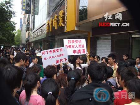 今日下午13时左右,记者收到网友线索,长沙黄兴路步行街有两个怪人举着“我要变性”的标牌,围观的市民把路口堵个水泄不通。记者随后赶到,发现其中一人正是前段时间频频曝光的“准”变性人申清清,另一个“怪人”则自称“美代子”。