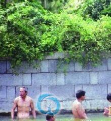 当记者来到乐川街白浪河桥北侧的“芙蓉台”景点时,发现河西有大批下河游泳者,一数竟有16人之多,而其中完quan*泳的有14人。而就在离这些裸泳者20米的凉亭内,就有两名正在休息的女园艺工。除了裸泳者,记者还在附近发现一名正在河面上划船的人。他乘的是一辆只容一人的简易竹船,靠一根约三米长的细竹竿划水前进,摇摇晃晃看起来十分危险。