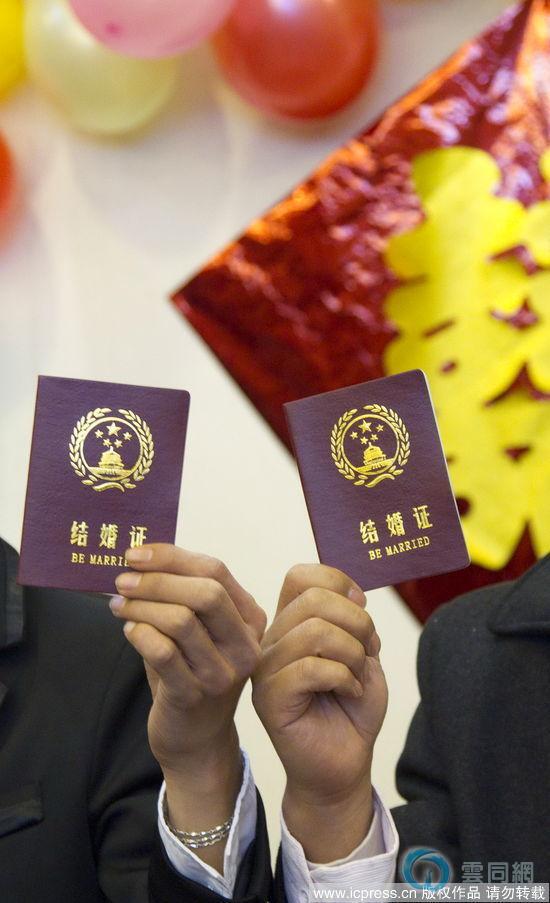 随后,证婚人肖冬向两位新人颁发了“结婚证”。“结婚证”的外观和内容均与普通《结婚证》相似,内页上贴有两人的大头贴合影,手写着新人双方的姓名、星座,在一段相守终生、不离不弃的结婚证言上,盖有“中国幸福婚姻委员会”的大红章。