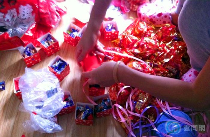 新郎说,他们准备了很久,通知了亲朋好友。自己网购喜糖纸盒,在超市里买大白兔,德芙,怡口莲等等,一个一个折叠盒子,把糖果,巧克力放进去。用丝带系好……像所有的结婚男女一样的在认真的准备着他们的婚礼。【图片由新郎提供】