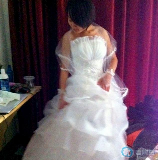 新郎说,新娘的婚纱是网购的,虽然不贵,但是她很喜欢,质量也确实不错。当她试穿婚纱的时候,看到她脸上幸福的笑容,我也觉得很开心……【图片由新郎提供】