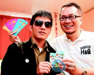 申请同性结婚登记遭拒的陈敬学(右)与高治玮,两人拿着“幸福卡”甜蜜合影。