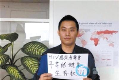李虎手持为HIV感染者争取“健康生存权”的字条。
