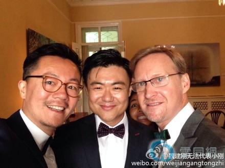 今天上午,33岁的张志鹄与50岁的戴维绅在英国驻华大使的见证下,缔结了婚姻。在中国,他们是第二对登记注册结婚的英国同性恋伴侣。“虽然他违背了我的传统,但我仍旧给他最大的祝福。”张志鹄的父亲在婚礼上说道。