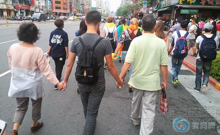 一位常驻台湾的德国记者10月25日在台北街头用照相机记录第12届台湾同志大游行,之后在Facebook分享了一张父母与同性恋儿子牵手前行的照片,令许多网友深受感动并留言支持。