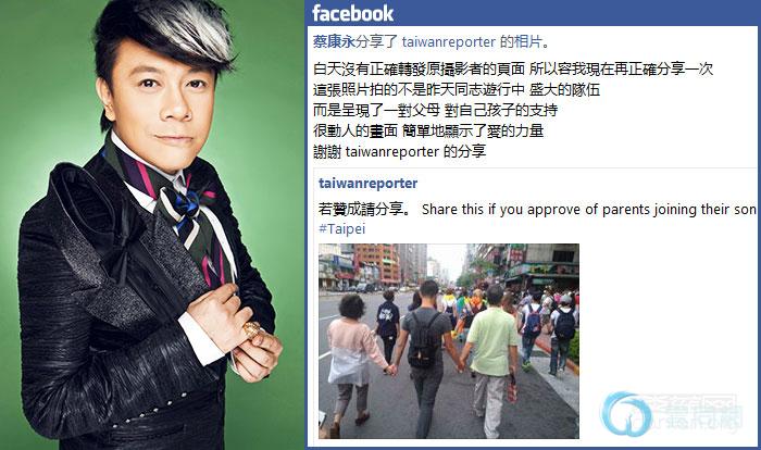 已经出柜的台湾艺人蔡康永看到照片后立即转发,他写道:“这张照片拍的不是昨天同志游行中盛大的队伍,而是呈现了一对父母对自己孩子的支持。很动人的画面,简单地显示了爱的力量。”