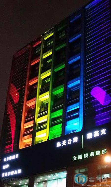 10月29日晚间,蔡英文竞选总部大楼首次点亮彩虹灯,鼓励大家一起参与10月31日的台湾同志游行。
