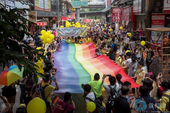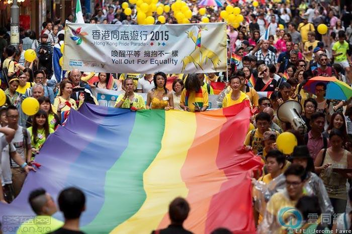 2015香港同志游行11月7日下午举行,主办方估计约9500人参加,包括香港平机会主席周一岳、“彩虹大使”张超雄和梁梓禧、立法会出柜议员陈志全,以及11个驻港领事馆代表。