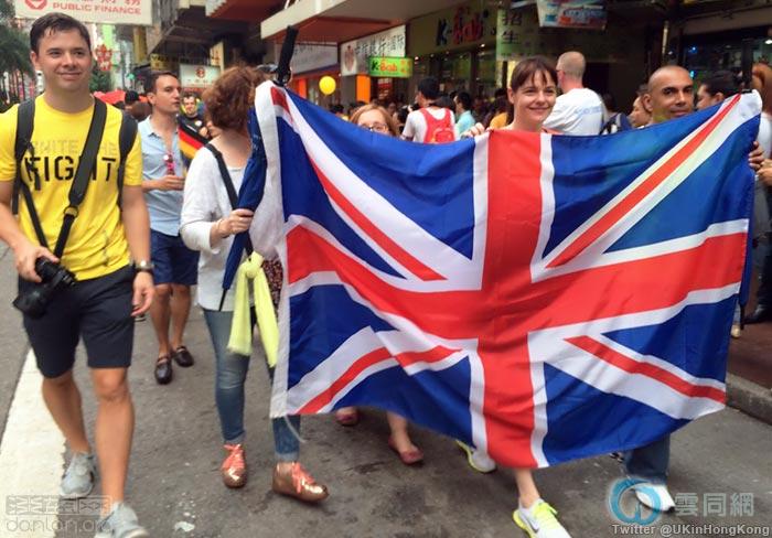 英国驻香港领事馆的成员也到场支持同志,领馆大楼特意挂出彩虹旗,其Facebook主页也换上了彩虹头像。