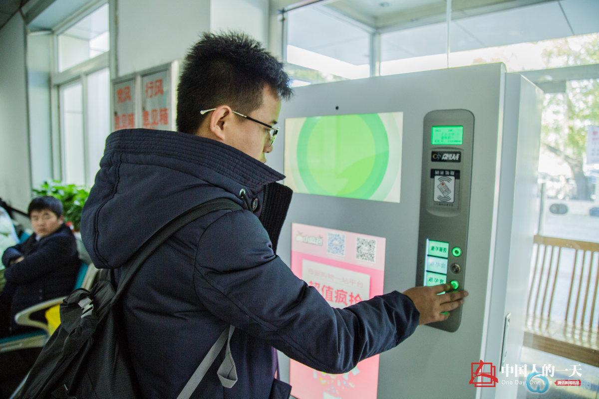 董文吉在医院自助机上领取免费安全套。从确诊后,他已连续服用了三年的抗病毒药物,他说:“除了保持这个习惯以外,自己生活和平常人没什么两样,有时候我会忘了自己是个艾滋感染者。有了同性伴侣,必须每三个月检测一次,发生一次同性高危性行为的感染率是百分之三。”