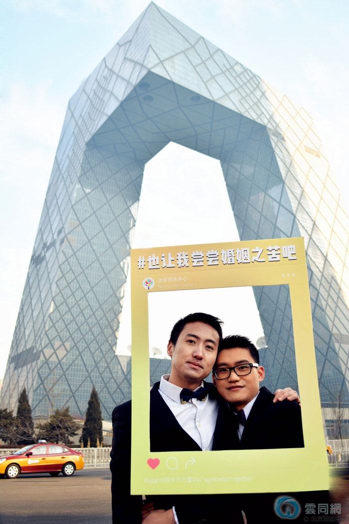 2017年情人节前夕,北京的鸟巢、水立方、北京大学正门、清华大学正门、颐和园正门、国子监、大栅栏、中央电视台总部大楼、五道营、烟袋斜街、前门等地标建筑前出现五对同志(LGBTIQ)“新人”,他们有的身着礼服,有的与新人造型的卡通展板合影。他们手上的Slogan表达了支持婚姻平权的主题。