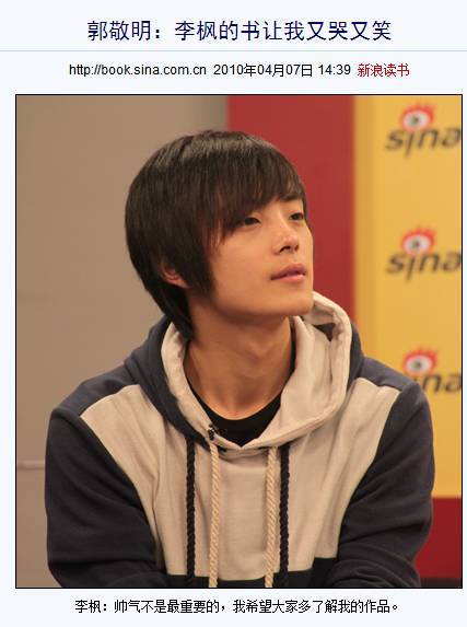 又过了5天,去武汉宣扬,郭敬明也是和李枫同行,当时他还口称郭敬明为“四爷”,称自己大二时就认识了郭敬明,谈到郭敬明满是尊敬:“他让我对事物的认识、写作和以后要走的路都产生了改变。”李枫还在采访中说出了这样的经典对白:郭敬明比韩寒更有影响力。