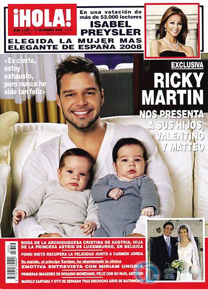 北京时间12月11日,拉丁天王,36岁的瑞奇-马汀与两个四个月大的双胞胎儿子首次亮相杂志封面,两个可爱的小婴儿分别叫马特奥和凡伦蒂诺,是瑞奇·马汀找代孕妈妈生下的。