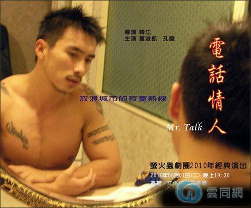 台湾联合报报导,萤火虫剧团挑战禁忌,演员背部全裸演出同志舞台剧《电话情人》,12岁以下不宜观赏。首次担纲的董浚凯,军职出身,现在是健身教练。