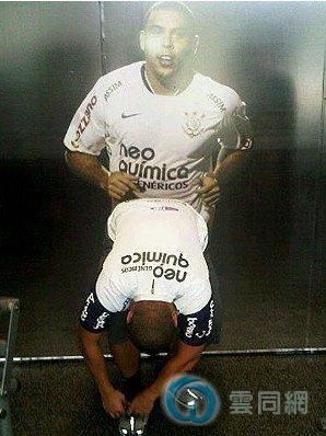 这张在罗纳尔多微博上的照片场景是科林蒂安的健身房,一张罗纳尔多的大幅海报前,一名身穿科林蒂安训练服的男子正半蹲着系鞋带,他的臀部正对着罗纳尔多的小腹。