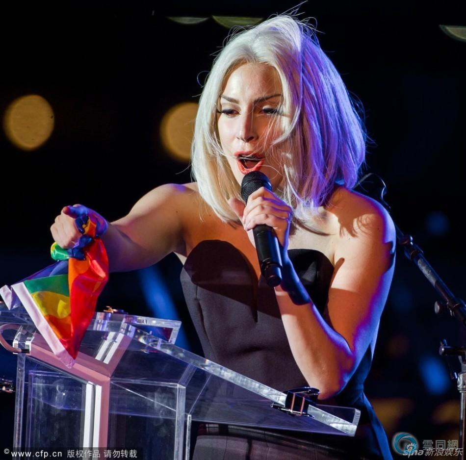 Lady GaGad手持支持同性恋小彩旗的GaGa穿着优雅现身演讲,并献唱经过歌词改编的美国国歌。引得献唱一片惊呼。正面优雅的礼服从侧面和背面看则“春光乍泄”,隐约露胸。