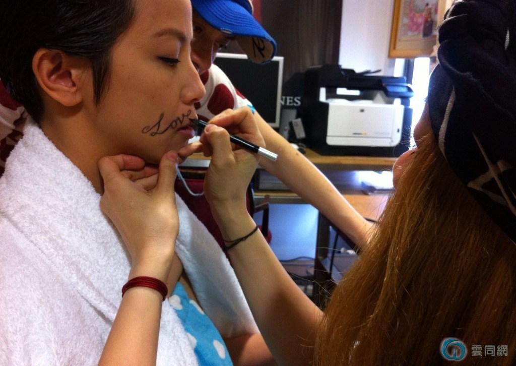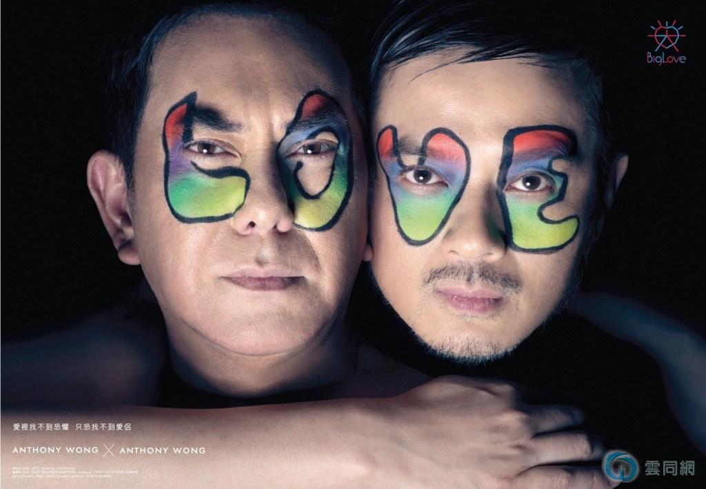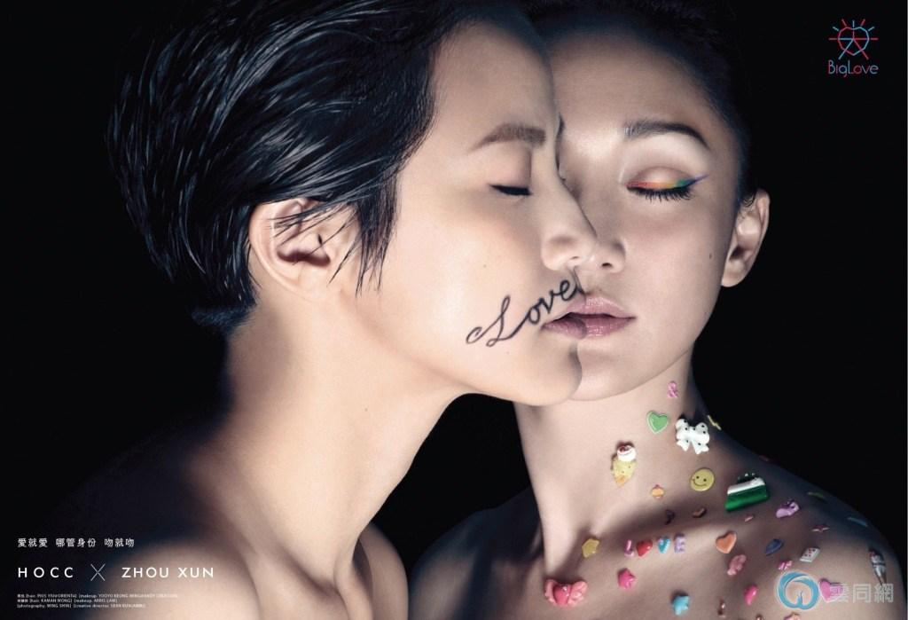海报中,黄耀明同黄秋生赤膊相拥,两人脸上画有LOVE彩绘;何韵诗则同周迅错位“亲吻”,阿诗嘴角画有“Love”字样胡须,周迅香肩贴满五彩贴纸,两人亲密依偎,宣扬爱无性别之限。