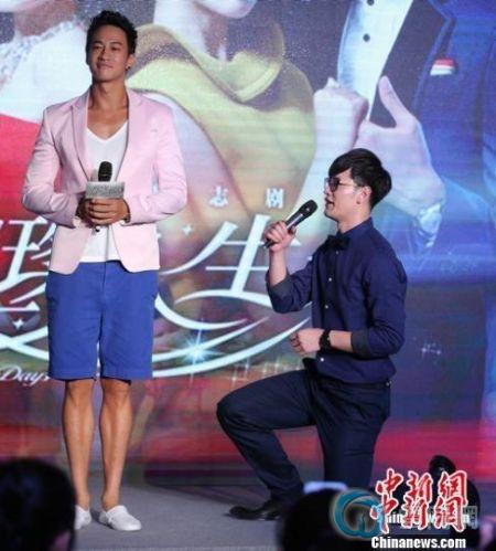 发布会的游戏环节上,张勋杰被要求向何润东求婚,两位男星最早面露尴尬,但在众人起哄下还是深情出演。