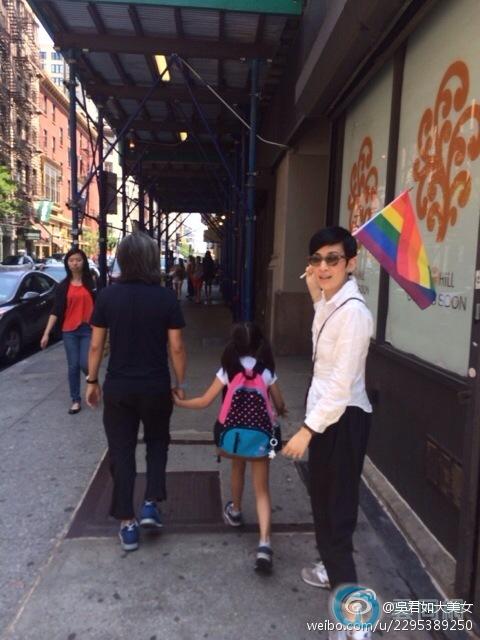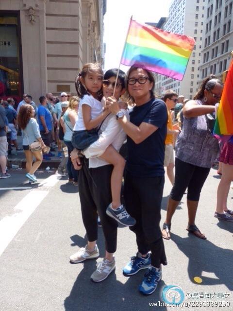 据台湾媒体报道,金马影后吴君如近来在第13届纽约亚洲电影节获颁“亚洲之星奖(Star Asia Award)”,她与陈可辛与女儿Jillian举家前往纽约领奖,适逢当地同志大游行,3人便一起挥舞彩虹旗参与活动。吴君如在微博分享照片,幽默自嘲写下:“一个gay和一个lesbian竟然可以生到一个女。”