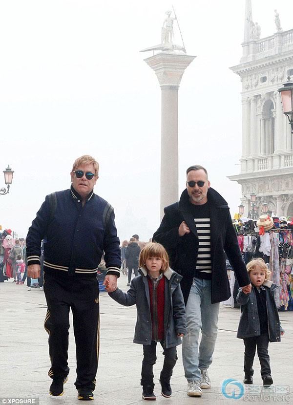 3月29日,艾尔顿·约翰(左)与家人在威尼斯度假