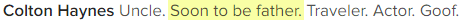 值得一提的是,科尔顿在个人简介里预告了一个惊喜:“即将成为爸爸。”
