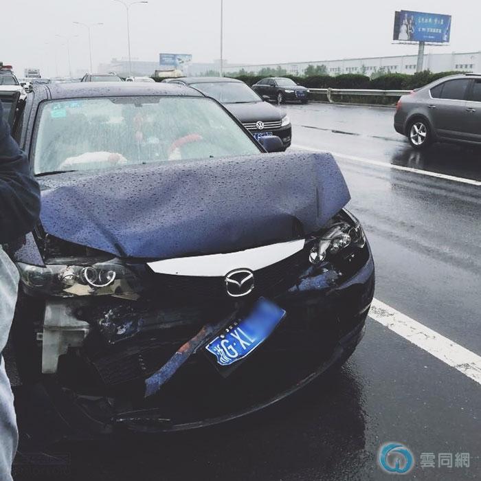 后面那辆车撞得面目全非,幸好人没事