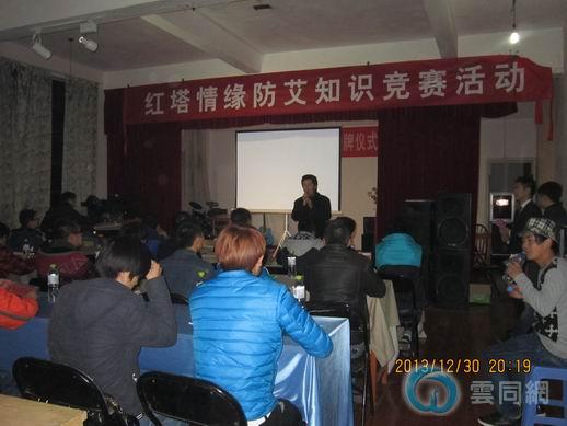 为广泛宣传艾滋病预防知识,提高MSM人群对艾滋病相关知识的认识水平和自我安全防护意识,营造良好的社会氛围,消除社会对艾滋病患者的歧视。2013年12月30日,红塔情缘工作室在蒙恩九州文化传播中心举办防艾知识竞赛活动。比赛前,市、区疾控中心的陈良、马懿副主任做了重要发言,并充分肯定了红塔情缘工作室2013年所取得的成绩,鼓励“红塔情缘”全体工作人员继续团结一心,为辖区MSM人群开展好防艾干预工作。接着,红塔情缘工作室负责人做了年终工作汇报。